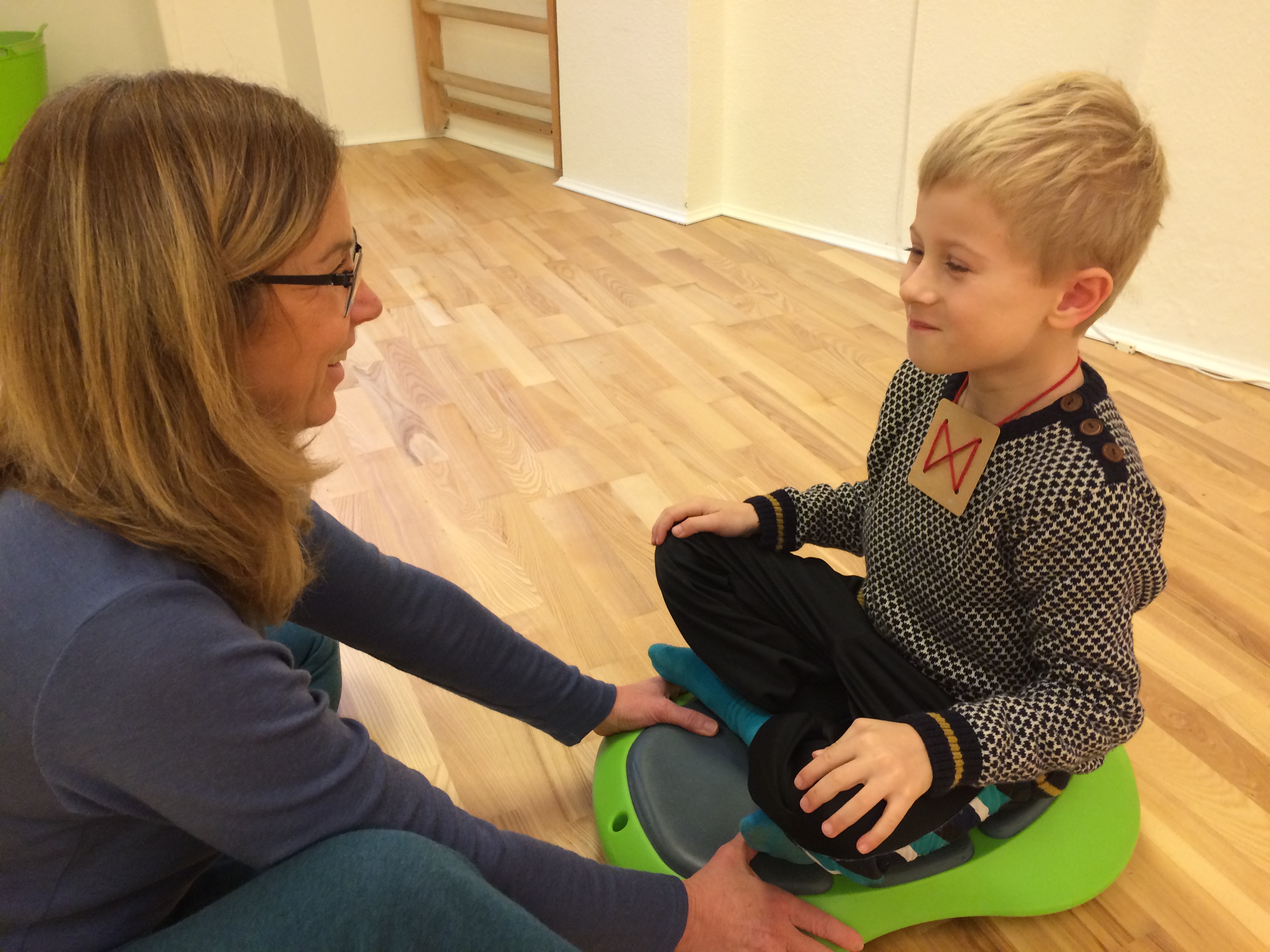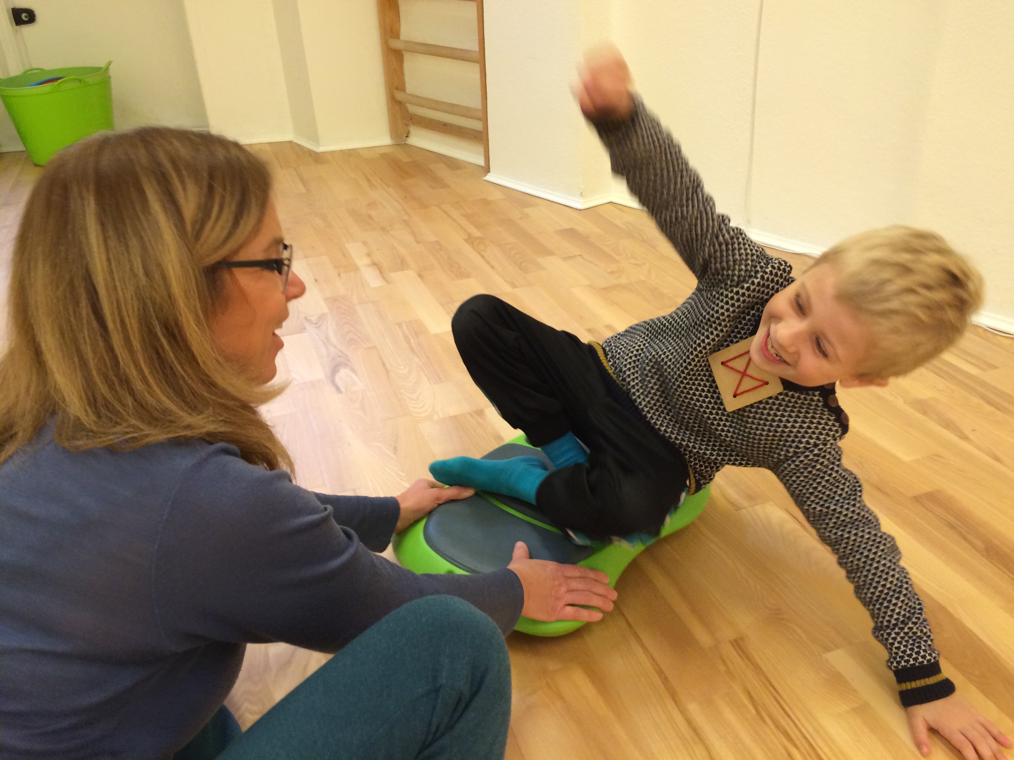 The goal of this exercise is to get John to manage six changes of direction on the Floor Surfer® without removing his hands from his knees. Every time his hand touches the floor, we start again. He has a clear goal, which motivates John and makes it easy for him to see that he is making progress.The exercise is simple and John finds it fun, because he makes rapid progress. We agree that he can do this exercise daily at home with his parents.I know that this exercise requires integration of the vestibular, proprioceptive and visual sensory impressions. This means that I can adjust several parameters if John is unable to master the exercise or if it becomes too easy.